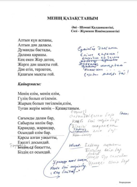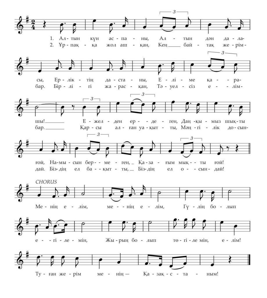 Музыка – композитора Шамши Калдаякова, слова – Жумекена Нажимеденова и Нурсултана Назарбаева.
